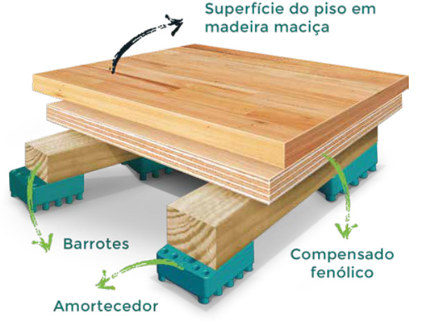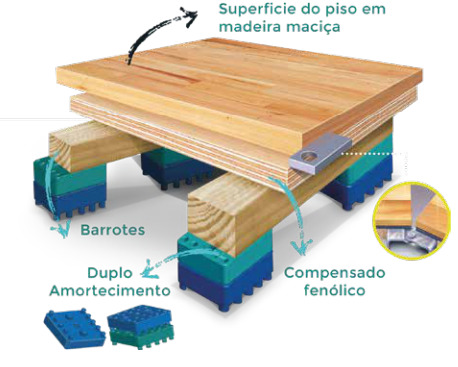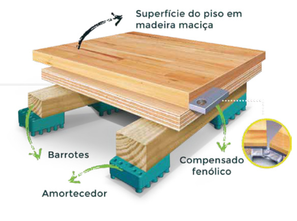Sistema: placas de madeira com duplo amortecedor de neoprene e laprene, barrotes, compensado fenólico, superfície do piso em madeira maciça, e fixadores entre-si.