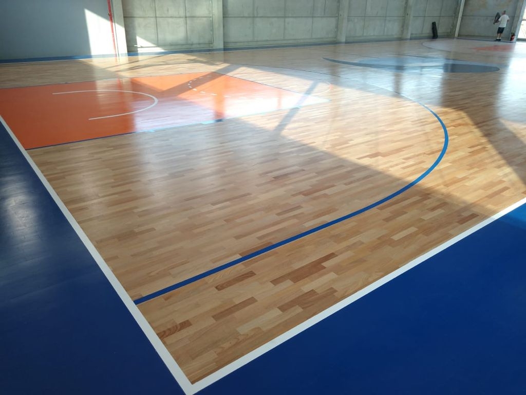 Sua base é composta por barrotes apoiada sobre um sistema de amortecedores com excelente absorção de impactos dos atletas sobre a superfície do piso.